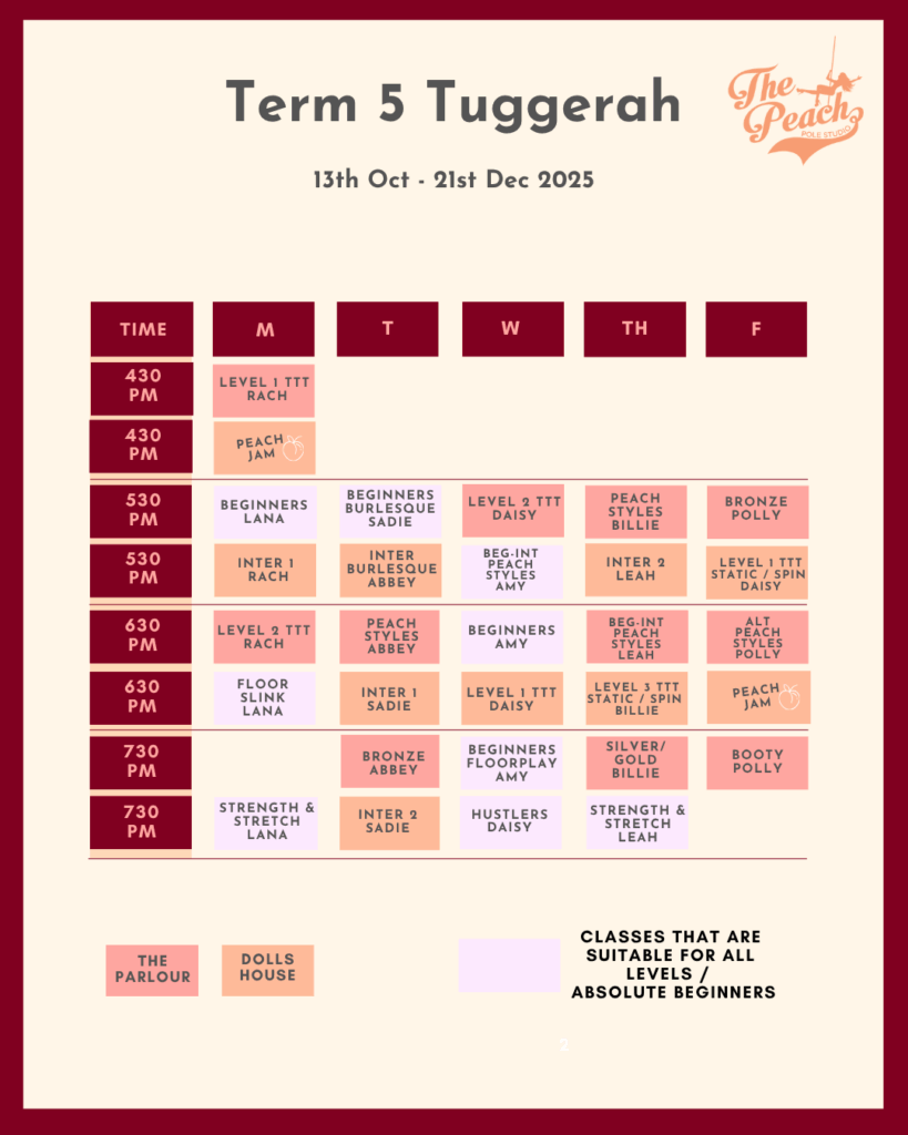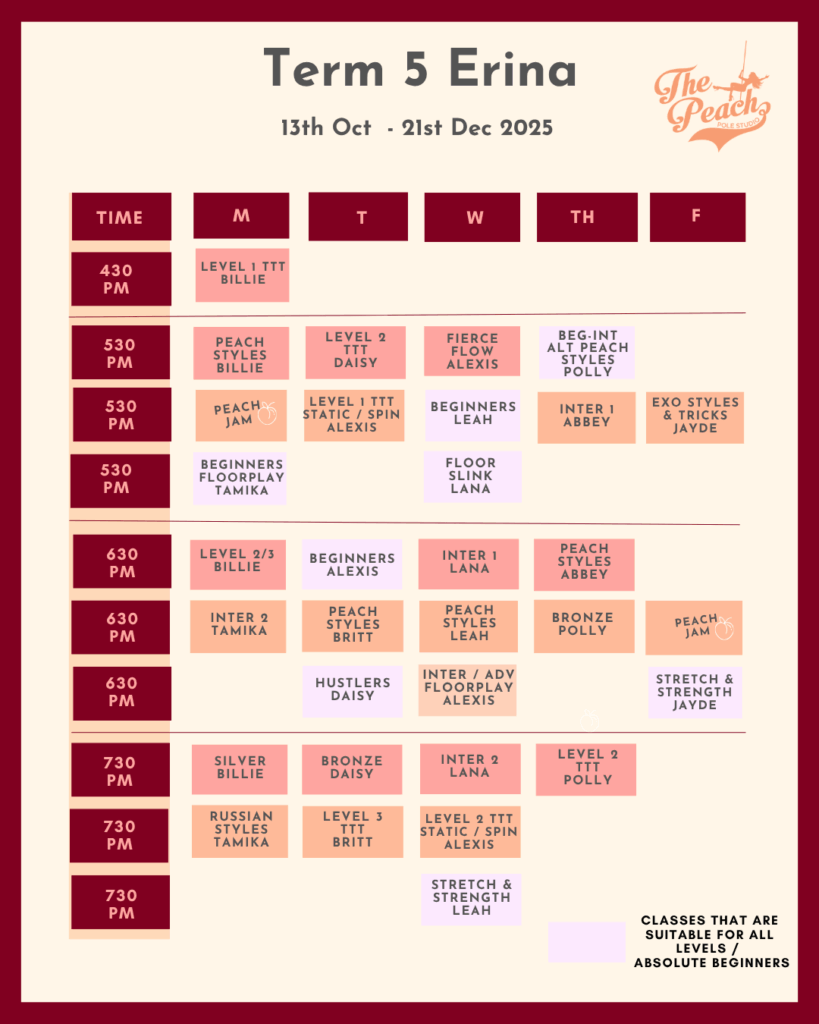 AVAILABLE FOR NEW PEACHIES! So if you’re new to Peach, and want to try a few styles of classes for your level – this is for you!